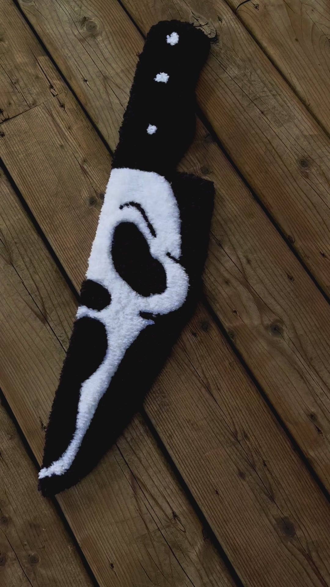 This handmade "Ghostface Knife" cut pile rug is made with acrylic yarn, monks cloth and felt backing. It's hand tufted, and then levelled, carved and sculpted with the utmost care and attention.