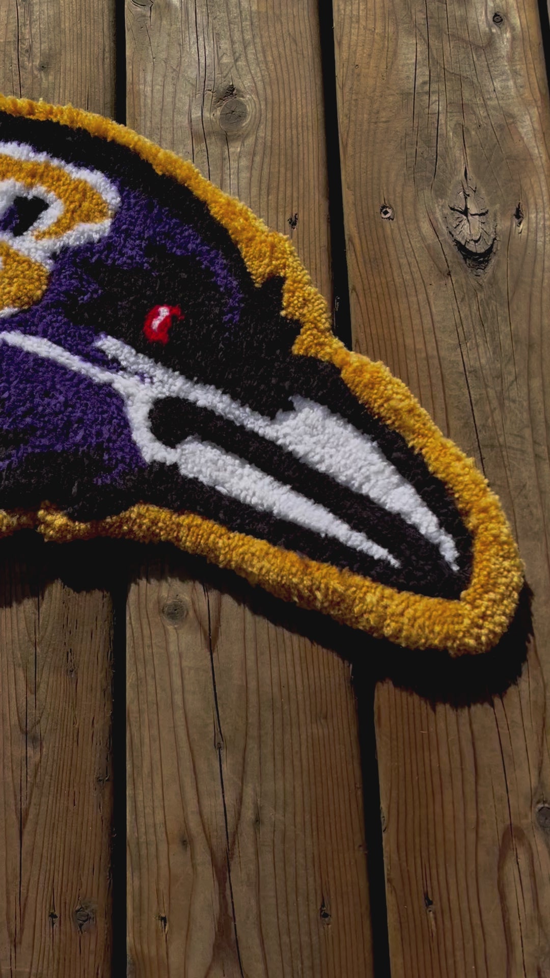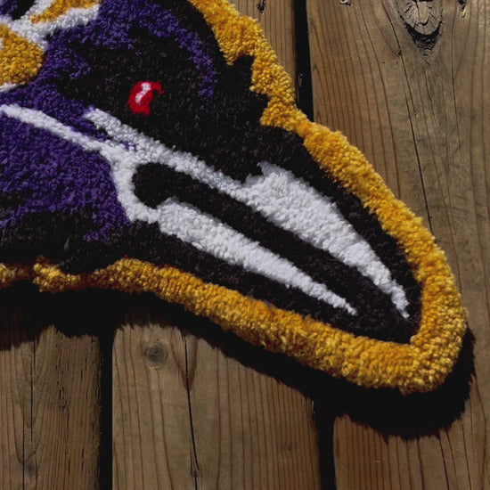 This handmade custom chosen NFL Football cut pile rug is made with acrylic yarn, monks cloth and felt backing. It's hand tufted, and then levelled, carved and sculpted with the utmost care and attention.