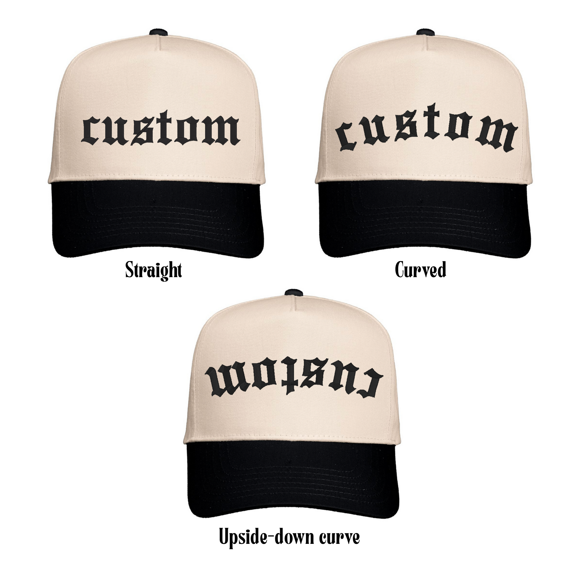 SEO Keywords: custom embroidered hat, personalized baseball cap, custom text snapback, two-tone trucker hat, custom logo hat, gift for him, gift for her, adjustable custom cap, personalized dad hat.