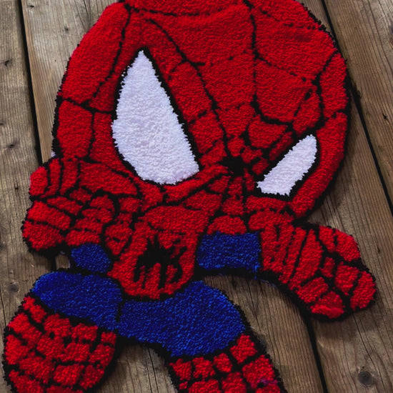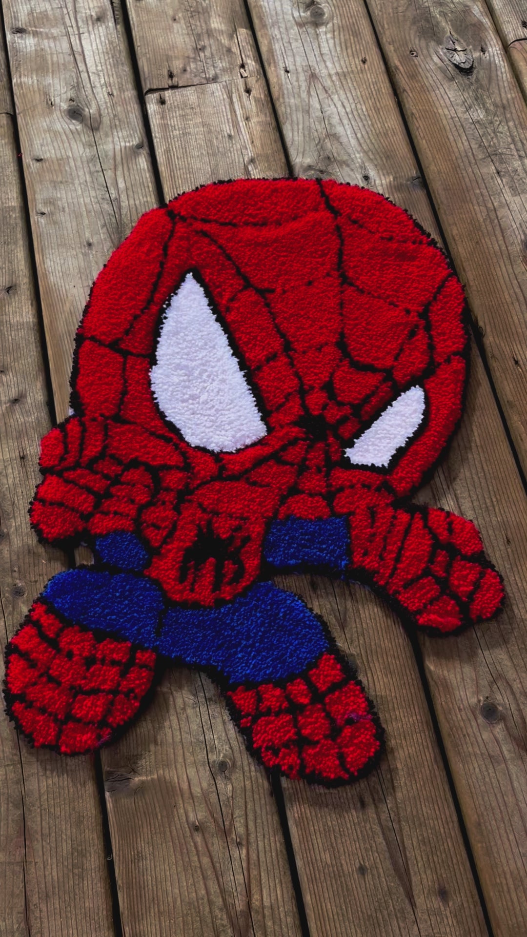 This handmade "Baby Spider-Man" cut pile rug is made with acrylic yarn, monks cloth and felt backing. It's hand tufted, and then levelled, carved and sculpted with the utmost care and attention.